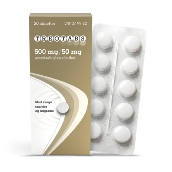 Treotabs er smertestillende tabletter, et håndkøbslægemiddel mod hovedpine, migræne og svage smerter som tandpine og menstruationssmerter. Treotabs indeholder 500 mg acetylsalicylsyre og 50 mg caffein - en kombination, der giver hurtig smertelindring, indenfor 30 minutter og som samtidig virker febernedsættende og antiinflammatorisk.